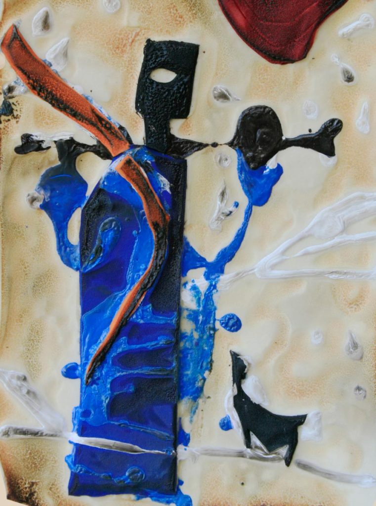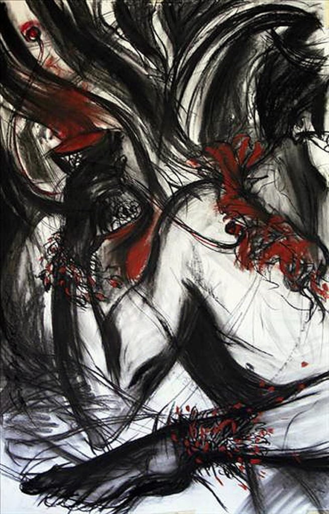 Soumitra Dasgupta experiments with flammable paint on rubber sheets and canvas to create a unique texture. This energy is carried forward from his exploration of the Chaitanya and Kali series, where destruction becomes a part of the form as well as the theme.